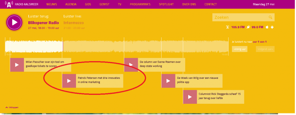 Blikopener Radio: Patrick Petersen met drie innovaties in online marketing, zie: https://radioaalsmeer.nl/programma/blikopener-radio/uitzending/2019-05-27/?uur=0&start=887