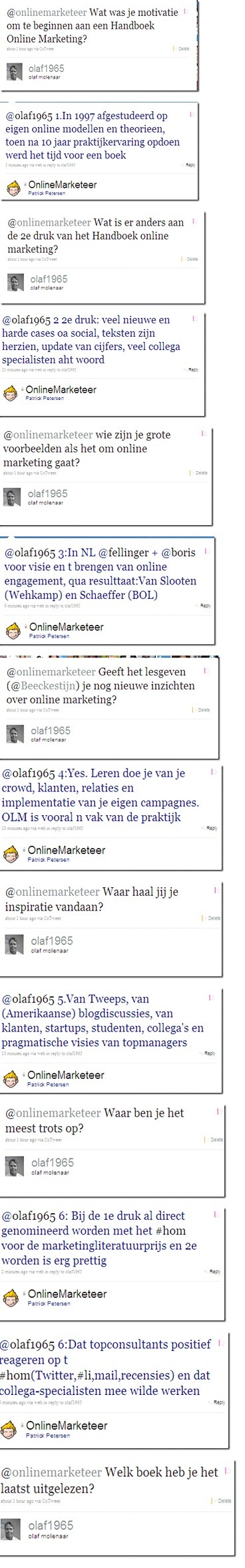 Begin juni viel mij de eer om -naar ik weet voor het eerst in Nederland- in het openbaar te worden geïnterviewd. Live geïnterviewd worden met het meekijken van duizenden Tweeps. Olaf Molenaar (onder andere gastdocent aan de HVU op gebied van bloggen) onderwierp mij op Twitter aan 10 directe vragen. Vraag en antwoord natuurlijk in 140 tekens. En da’s even wennen. Het effect? Een crowdsource van extra vragen die op mij af kwamen.