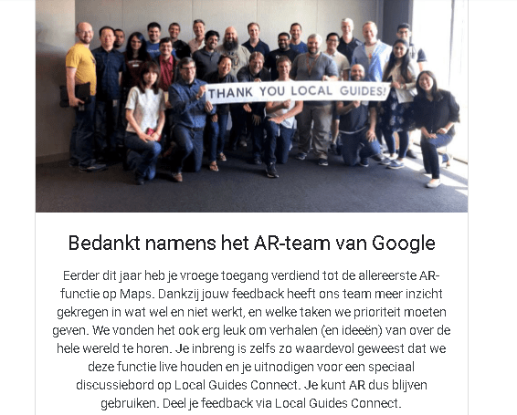 Door - Patrick PetersenGeplaatst op 6 mei 2019Geplaatst in AlgemeenGoogle mogen helpen met de nieuwe augmented reality Google Maps Google mogen helpen met de nieuwe augmented reality Google Maps, de video’s en trailers zijn al online beschikbaar, de mogelijkheden gaan wij heel heel heel snel ervaren 🙂 Tags:Google Local Guide